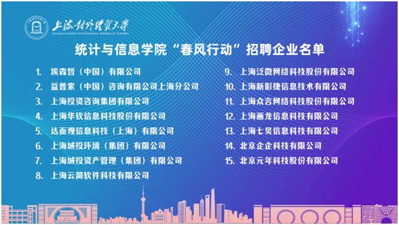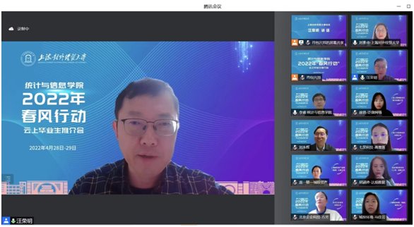 上经贸大统计与信息学院举行的“春风行动”,每周都会在线举办“云上毕业生推介会”。首场集中推介会于4月28日和29日两天滚动举行,吸引了埃森哲(中国)有限公司、上海投资咨询集团有限公司、上海泛微网络科技有限公司等15家用人单位,提供近60个就业岗位。25人初步达成了就业意向,约占招聘岗位的二分之一。