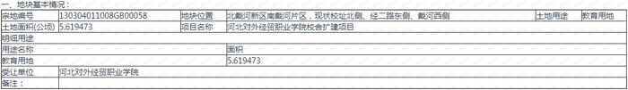 摘要:宗地编号为130304011008GB00058,位于北戴河新区南戴河片区,现状校址北侧、经二路东侧、戴河西侧,土地用途为教育用地,土地面积为56194.73㎡。 地图显示,河北对外经贸职业学院在售楼
