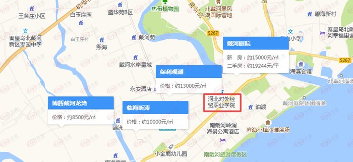 地图显示,河北对外经贸职业学院在售楼盘有保利观潮、戴河庭院、临海听涛和博辉戴河龙湾等,销售均价在8500-15000元/㎡区间。
